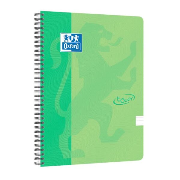 Blok špirálový Oxford Nordic Touch A4+/70 listov linajkový, zelený na dvojitej čiernej špirále, dosky z tvrdého kartónu so soft touch povrchom, kompatibilný so SCRIBZEE, biely, dokonale hladký papier Optik Paper+, neprepíja, certifikácia EÚ Ecolabel.