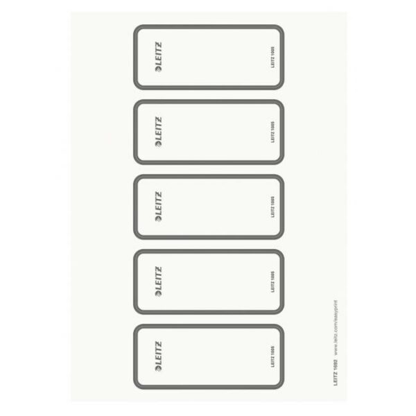 Samolepiace potlačiteľné chrbtové štítky, ktoré uľahčujú a sprehľadňujú popis zakladačov Leitz WOW. Široké 80 mm, pre široký pákový zakladač Leitz 180° WOW (1005). Štítky sú perforované na hárku A4 pre jednoduchšiu manipuláciu. Navrhnite a vytlačte si svoj štítok na www.esselte.com/easyprint . 1 balenie = 10 hárkov (50 štítkov). Vhodné do laserových i atramentových tlačiarní a kopírok. Faba biela.