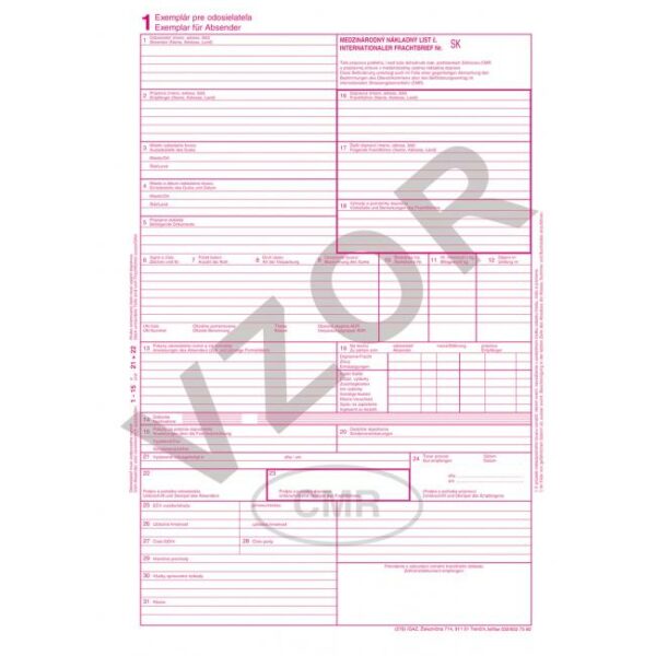 Evidenčné a colné tlačivá. CMR, 7 listov, balenie 100 súprav. Samoprepis.