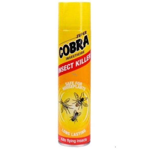 Super Cobra insekticíd na hubenie lietajúceho hmyzu. Hubí lietajúci hmyz v domácnostiach aj vonkajších priestoroch. Rýchlo hubí lietajúci hmyz ako muchy, komáre, osy, mole, ovady a iné. Muchy a komáre – 99% úmrtnosť po 24 hodinách. Návod na použitie: Zatvorte okná a dvere, nádobu dobre pretrepte pred postrekom aj počas neho. Striekajte v krátkych dávkach.