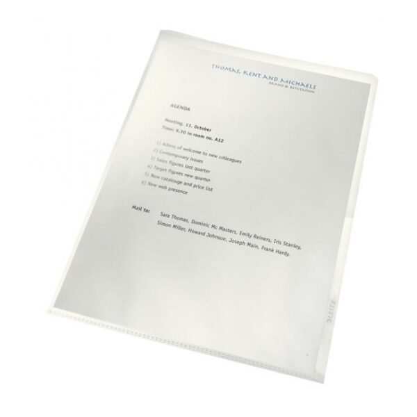 Ekologický priehľadný obal `L` na dokumenty vyrobený zo 100% priemyselného polypropylénu PP. Súčasť ekologického radu Leitz Re:cycle. Zo 100% recyklovaného a 100% recyklovateľného materiálu. Embosovaná PP fólia 0,14 mm (Copysafe). Vykrojenie pre jednoduchšiu manipuláciu s dokumentmi. Pre formát A4. Kapacita: 40 listov A4 (80 g/m2)