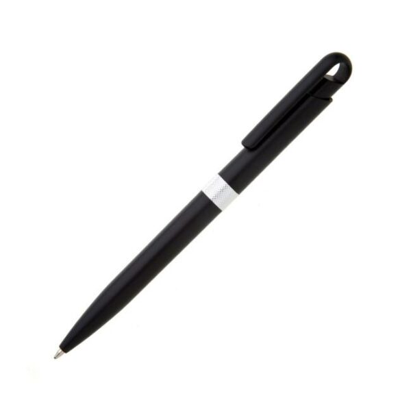 Plastové guľôčkové pero FIROL v metalických farbách. Uprostred pera je stieborný krúžok. Modrá náplň veľkoobjemová. Kolekcia DESIGN. Farba čierna.