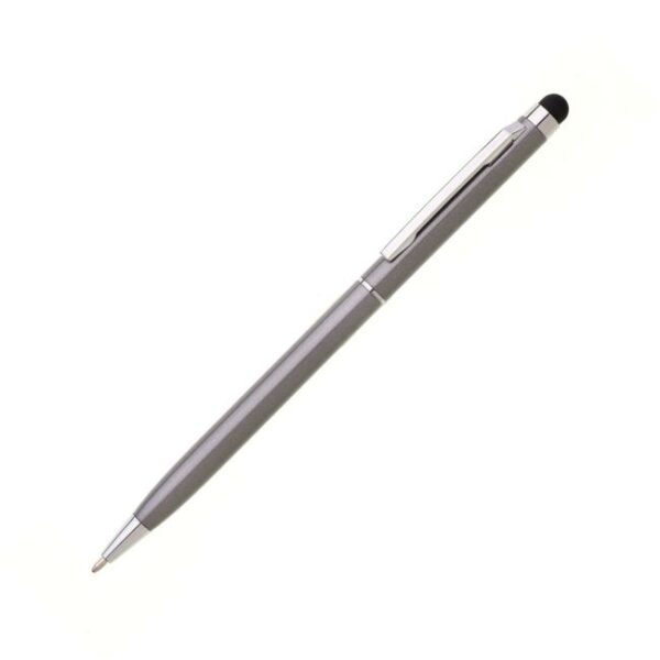 Tenké kovové guľôčkové pero s otočným mechanizmom a hrotom pre ovládanie dotykovej obrazovky. Strieborné chrómové doplnky, modrá náplň cross. Materiál hliník.