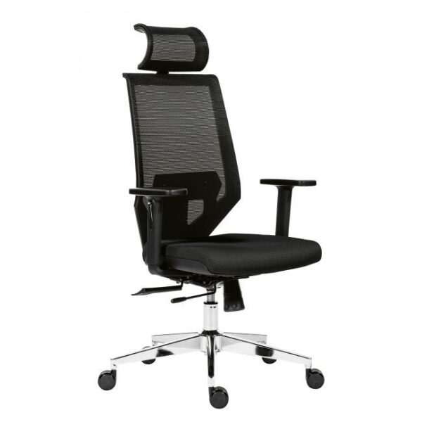Kancelárska stolička so sieťovaným operadlom a uhlovo nastaviteľným podhlavníkom.