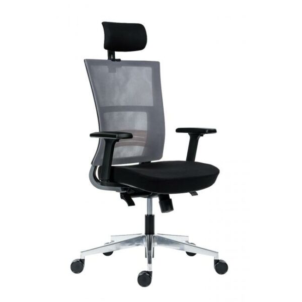 • kancelárska stolička s vysokým priedušným operadlom, opierkou hlavy, podrúčkami a molitánom sedáku zo studenej peny, synchrónny mechanizmus s nastavením sily protiváhy