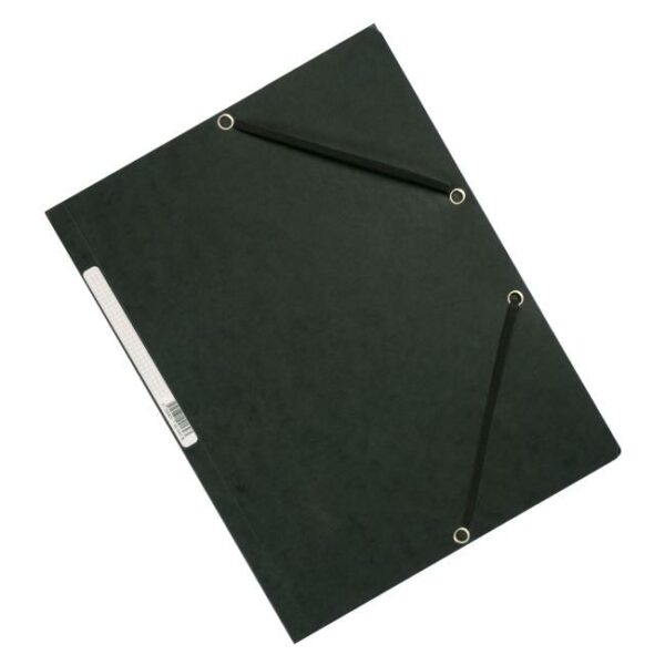 Obal s tromi chlopňami a gumičkou z kvalitného hladkého kartónu gramáže 375 g. Chrbtový štítok, kapacita 200 listov. Farba čierna.
