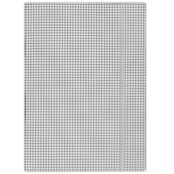 Kartonový obal vyrobený z lepenky s hmotnosťou 400g. Jednostranne potiahnutý vysoko lesklým tlačovým lakom, okrúhla vertikálna guma vo farbe obalu chráni obsah pred vykĺznutím. Károvaná potač. Formát: A4. Farba biela. Rozmery 232 x 317 mm.