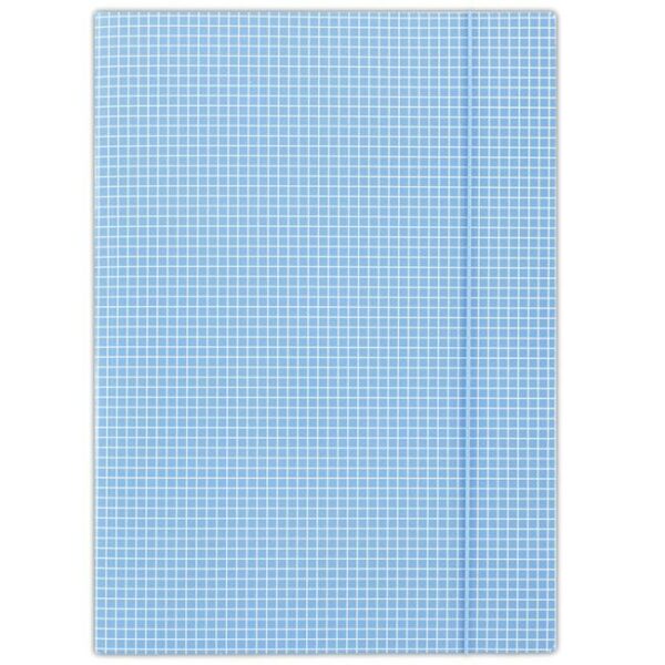 Kartonový obal vyrobený z lepenky s hmotnosťou 400g. Jednostranne potiahnutý vysoko lesklým tlačovým lakom, okrúhla vertikálna guma vo farbe obalu chráni obsah pred vykĺznutím. Károvaná potač. Formát: A4. Farba modrá. Rozmery 232 x 317 mm.