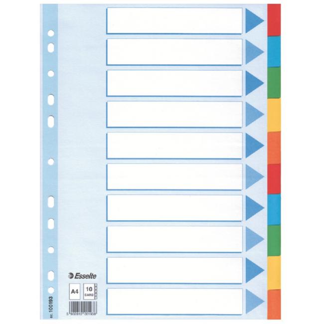 Celofarebný rozraďovač Esselte vyrobený z kartónu v rôznych farbách. Formát A4, eurodierovanie, popisovateľný titulný list na jasnú identifikáciu obsahu. Balenie jedna sada v polyesterovom sáčku. Väčšie balenie 10 sád.