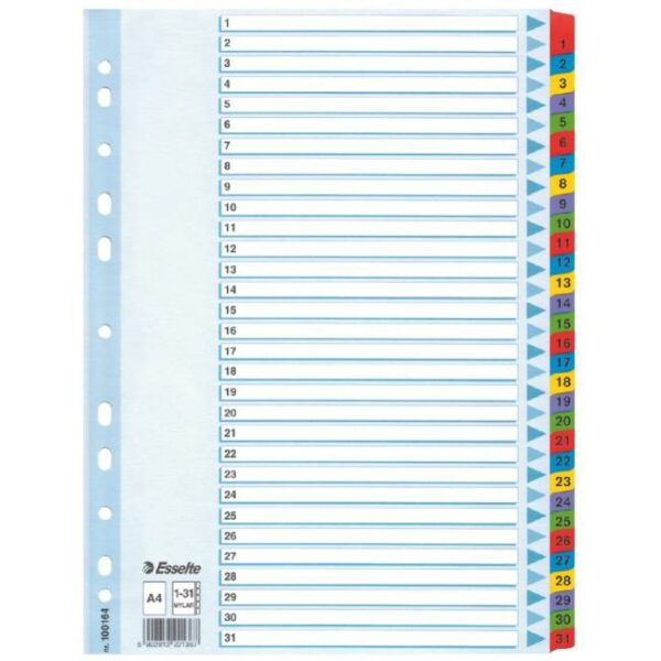 Rozraďovač vyrobený z kvalitného silného kartónu. Formát A4, vystužené eurodierovanie, farebné plastové rozlišovacie okraje, popisovateľný titulný list s farebnou potlačou na jasnú identifikáciu obsahu. Balenie jedna sada v polyesterovom sáčku. Väčšie balenie 10 sád.
