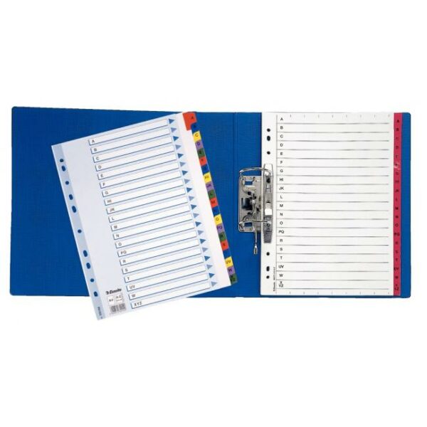 Rozraďovač vyrobený z kvalitného silného kartónu. Formát A4, vystužené eurodierovanie, farebné plastové rozlišovacie okraje, popisovateľný titulný list s farebnou potlačou na jasnú identifikáciu obsahu. Balenie jedna sada v polyesterovom sáčku. Väčšie balenie 10 sád.