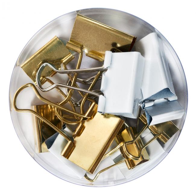 Kovové klipy Pure Glam v zlatej a bielej farbe po 2 z veľkostí 19, 25 a 32 mm. Balenie 12 ks.