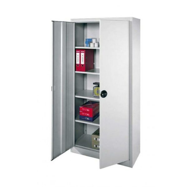 Univerzálna kovová skriňa do kancelárií, skladov a dielní. 4 nastaviteľné police s nosnosťou 50 kg pri rovnomernom zaťažení police, cylindrický zámok s trojcestným rozvorovým mechanizmom a 2 kľúčami. Hladká povrchová úprava vypalovaným lakom v sivom odtieni RAL 7035.