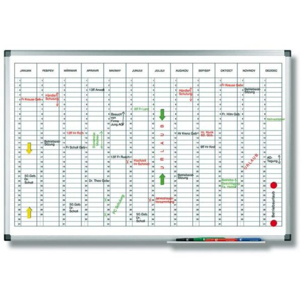Tabuľa s popisovateľným magnetickým a špeciálne lakovaným a UV tvrdeným povrchom vo verzii ročného plánovača s názvami mesiacov v hornom riadku (`diárový` štýl). Ideálna ako `personálny` plánovač. Magnetický povrch. Sada príslušenstva zahŕňa 4 stierateľné popisovače TZ 111 a 10 mm magnetické symboly.
