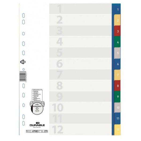 Farebný číselný rozraďovač vyrobený zo zosilneného plastu s eurodierovaním, popisovateľný papierový titulný list na ľahkú orientáciu v dokumentoch. Výsledný dokument pôsobí upravene a reprezentatívne. Väčšie balenie 20 sád.