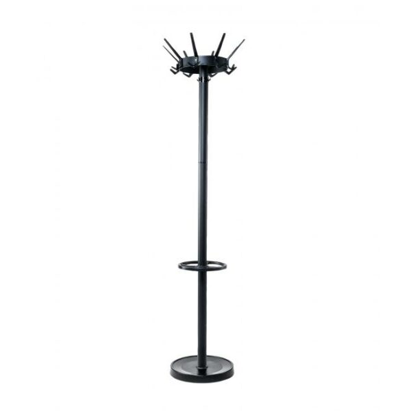 Vysokokvalitný oceľový vešiak je obzvlášť vhodný do prevádzok s vysokou premávkou, ako sú verejné priestory, úrady a pod. Robustný a elegantný oceľový stĺpik s matným čiernym práškovým náterom, ťažký betónový podklad potiahnutý plastom na zabezpečenie mimoriadnej stability. Matný povrch odolný proti poškriabaniu dáždnikom, 8 vešiakov na klobúky a 16 na kabáty z odolného ABS plastu, 4 prídavné plastové háčiky pod vešiakmi a 4 háčiky na stojane na dáždniky, stojan