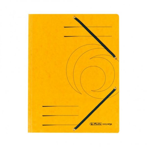 Obal A4 s tromi chlopňami a dvomi gumičkami čiernej farby. Materiál prešpánový kartón gramáže 355 g / m². Väčšie balenie 25 ks. Farba žltá.
