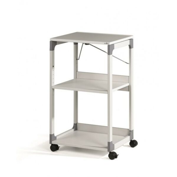 Mobilný projekčný vozík s tromi policami. Horná polica je odnímateľná a pri projekcii sa dá naklopiť do 180°, stredná polica je výškovo nastaviteľná po 32 mm, spodná polica je fixná. Hrúbka políc 19 mm. Materiál pevný kovový lakovaný rám s rohovými spojkami z plastu. Farba sivá. Rozmery š × v × h 508 x 882 x 432 mm.
