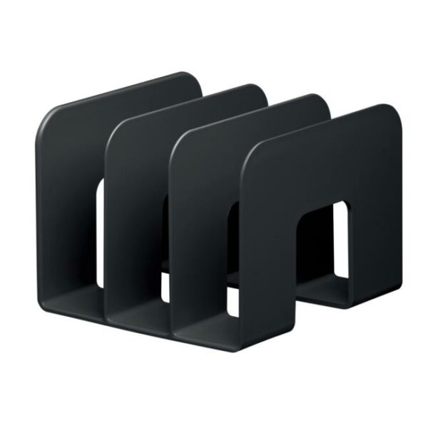 Trojpriehradkový stojan na katalógy pre flexibilné použitie. Vyrobený z recyklovaných plastov v kvalite Blue Angel. Priehradky široké 65 mm. Jednoduché zasúvanie a vyberanie. Vhodný pre časopisy, brožúry, katalógy atď. Rozmery: 215 x 165 x 210 mm (Š x V x H). Farba čierna.