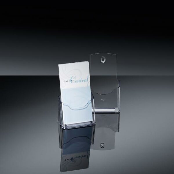 Stolný stojan s jedným odkladačom unikátneho dizajnu z vysokokvalitného akrylu. Ideálny na brožúry, katalógy a letáky. Hĺbka odkladača 30 mm. 25-ročná záruka na odolnosť voči UV žiareniu. Rozmery 125 × 200 × 75 mm. Farba číra.