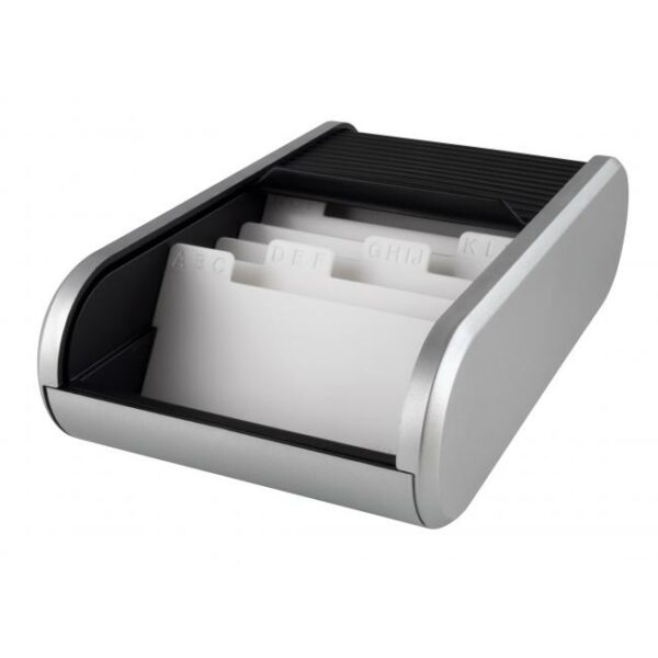 Kartotéka na vizitky v dizajne rady Linear s ôsmimi abecedne zoradenými sekciami, rolovacím krytom a gumenými podložkami. Kapacita 300 vizitiek.