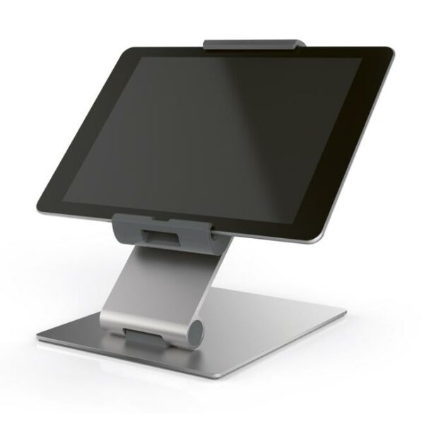 Rotačný stojan 360 ° na stôl na tablety od 7 do 13 ` na výšku alebo na šírku s jednoduchým vkladaním a vyberaním tabletu. Uchytávacie body po 90 °, ochrana pred bočným vybratím tabletu, premenlivý uhol sklonu ramena od 0 ° do + 88 °, symetrické otváranie držiaka od 160 do 275 mm. Otvor v stojane slúži ako výstup pre nabíjací kábel. Uzamknutie držiaka pomocou špeciálneho kľúča. Materiál hliník, ASB a oceľový plech. Dodatočná ochrana proti krádeži pomocou káblového zámku (nie je súčasťou balenia). Rozmery 155 × 242 × 183 mm.