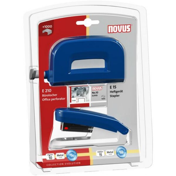 Ľahká praktická kancelárska zošívačka a dierovačka z kolekcie Evolution, dodávaná so spinkami. Zošívačka má vrchný diel z plastu a integrovanú kovovú rozošívačku na zadnej časti. Kapacita náplne 100 spiniek veľkosti No.10. Hĺbka zošívania 3,7 cm. Dierovačka má kovovú základňu, plášť v plastovo-kovovom prevedení a posuvné pravítko. Rozpätie dier 8 cm. Farba modrá/sivá.