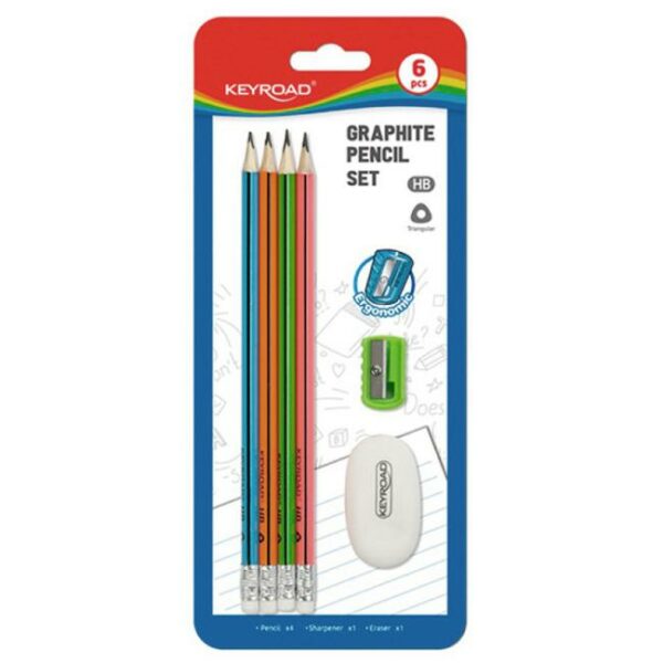 Sada školských pomôcok KEYROAD, 6 ks: drevená ceruzka HB trojuholníková, s gumou 4 ks, plastové strúhadlo 1 ks, guma 1 ks. Balenie: blister. Farba: mix farieb.