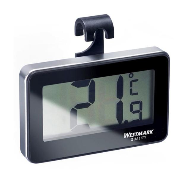 Digitálny teplomer do chladničky od spoločnosti Westmark. Na meranie izbovej teploty aj teploty v chladničke. Klip na zavesenie alebo postavenie. Prídavný magnet. Celkový rozsah teploty: -20 °C až +50 °C. WEEE Reg.č.: DE 813 850 81