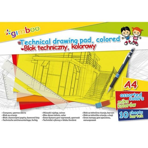 Výkresy, lepenie po kratšej strane, hladké. Počet listov 10, gramáž: 150 gsm. Mix farieb, formát A4.