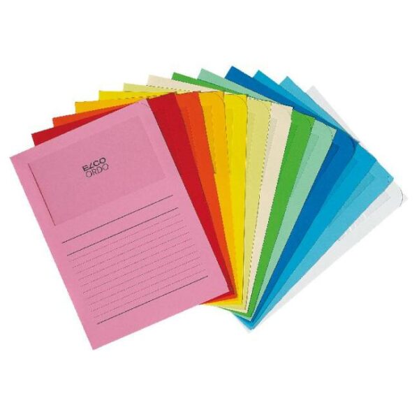 Farebné zakladacie zložky 220 × 310 mm s praktickým oknom z fólie rozmerov 180 × 100 mm. Vynikajúci systém popisovateľných zakladacích záložiek, poskytujúci možnosť farebného rozlíšenia. 120 g