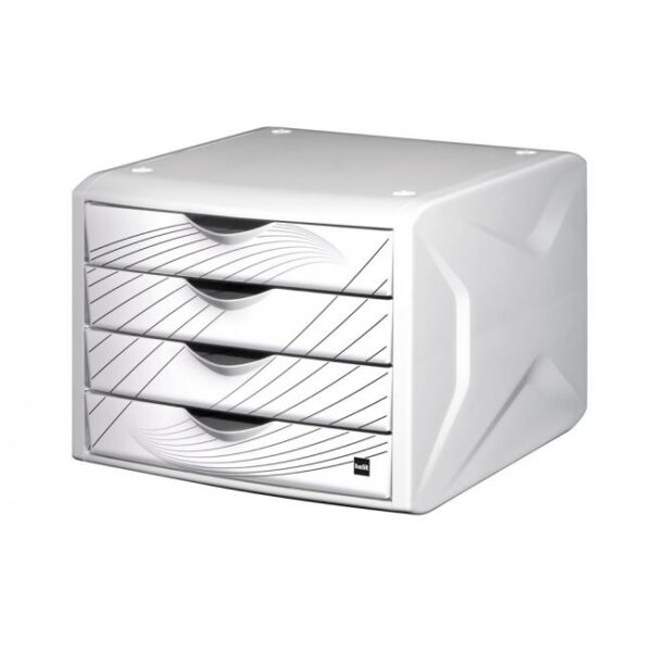 Stohovateľný box z odolného polypropylénu so štyrmi zatvorenými zásuvkami a dekoráciou na prednej strane zásuviek. Svieži dizajn. Rozmery (š × v × h) 262 × 212 × 330 mm.