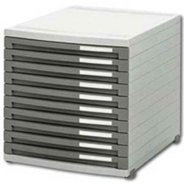 Box z modulárneho systému zásuvkových boxov s horizontálnym aj vertikálnym spájaním. Model so zatvorenými zásuvkami (bez predného krytu) výšky 25 mm a zarážkou chrániacou zásuvky pred úplným vysunutím. Súčasťou sú identifikačné menovky na označenie zásuviek.Telo boxov vo svetlosivej farbe, zásuvky tmavosivé. Rozmery (š × v × h) 30 × 30,7 × 38,2 cm.